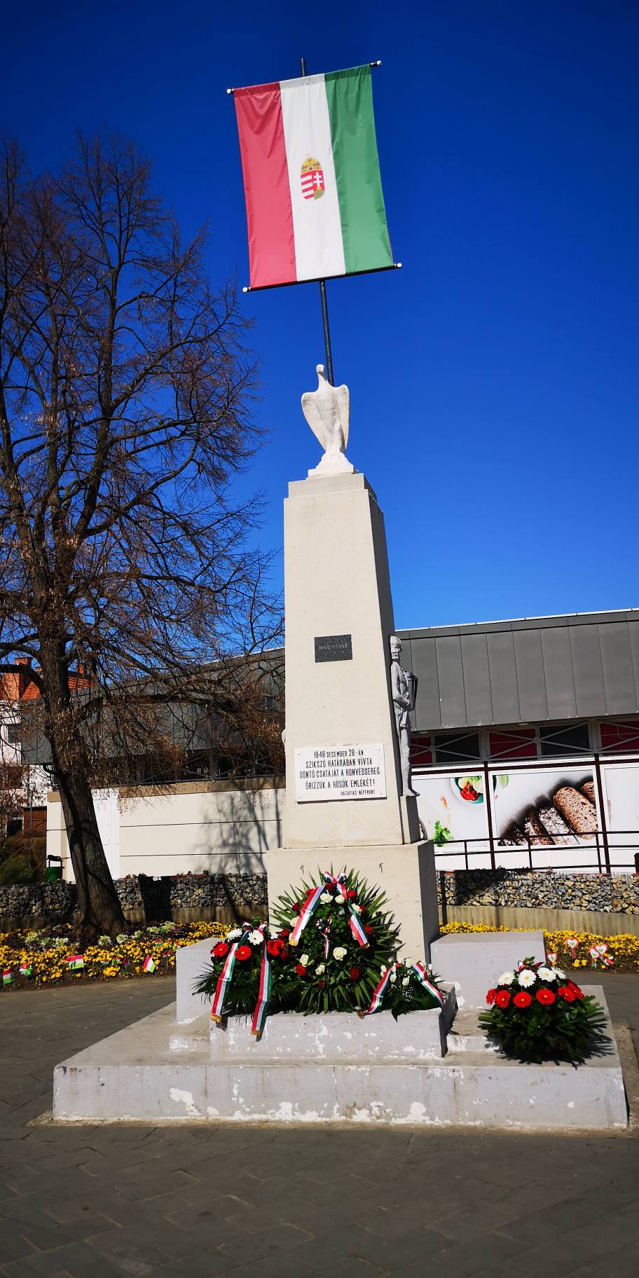 A megemlékezés a szikszói főtéren folytatódott, ahol a résztvevők koszorúzással fejezték ki tiszteletüket a forradalom és szabadságharc hősei előtt.